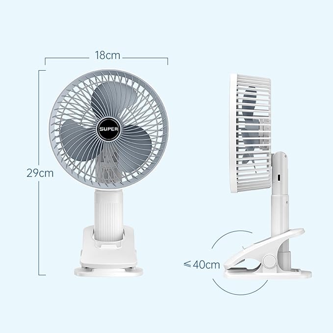 • تأتي المروحة مع مشبك، مما يتيح تثبيتها بسهولة على الأسطح المختلفة.